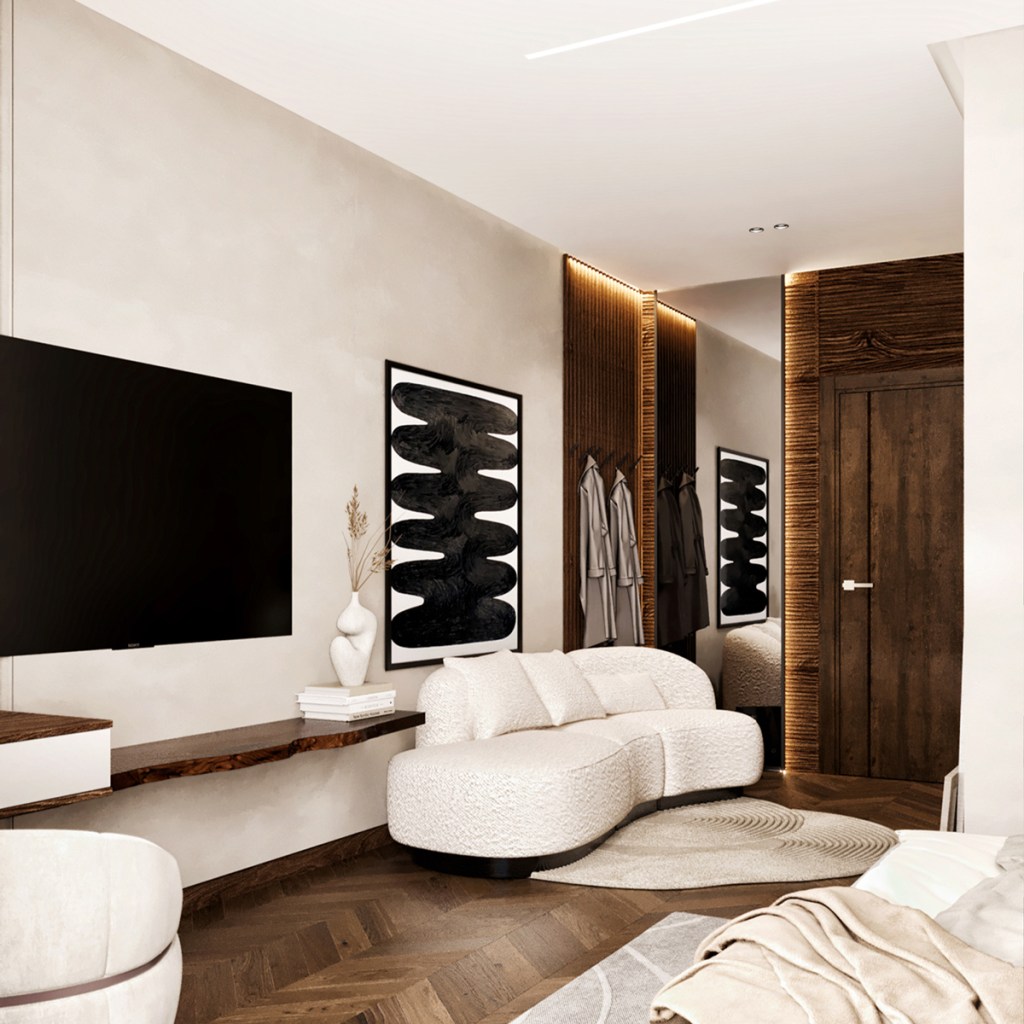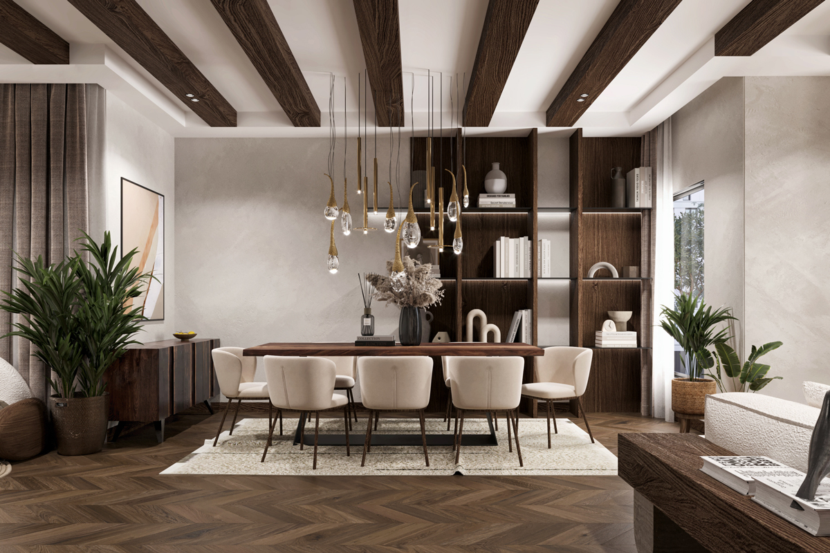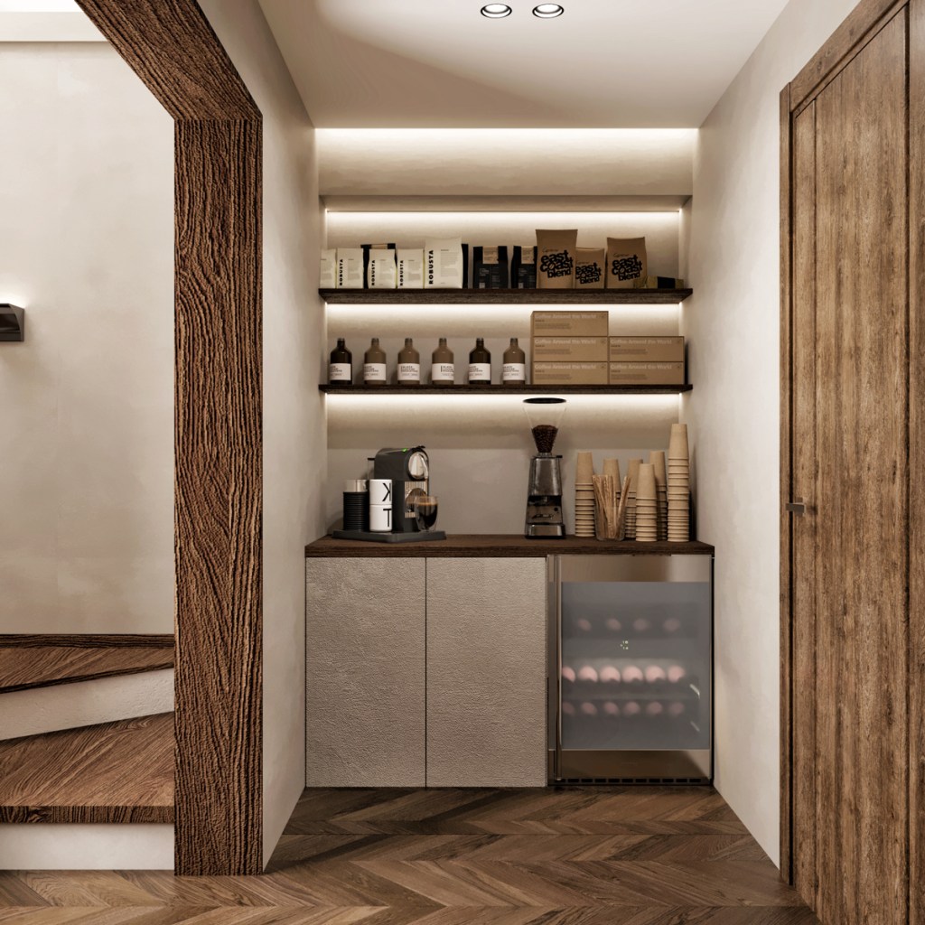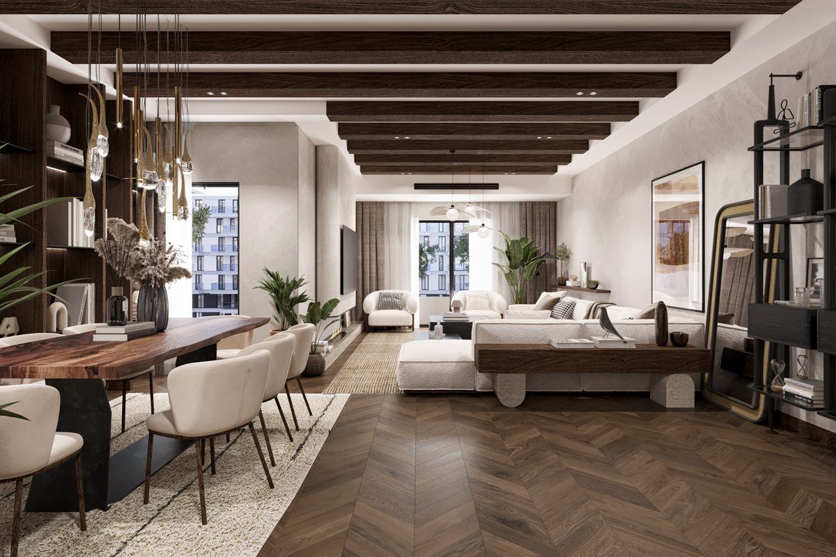 The reception area features a wooden floor, which adds warmth and character to the space. The use of wood extends beyond the floor, with wooden tables and accents strategically placed throughout the area. Contributing to the rustic aesthetic and create a cohesive design. To maintain a neutral and light color palette, the furniture is selected in shades of beige, cream, and light gray. This choice of colors creates a serene and calming environment, allowing visitors to feel relaxed and comfortable.