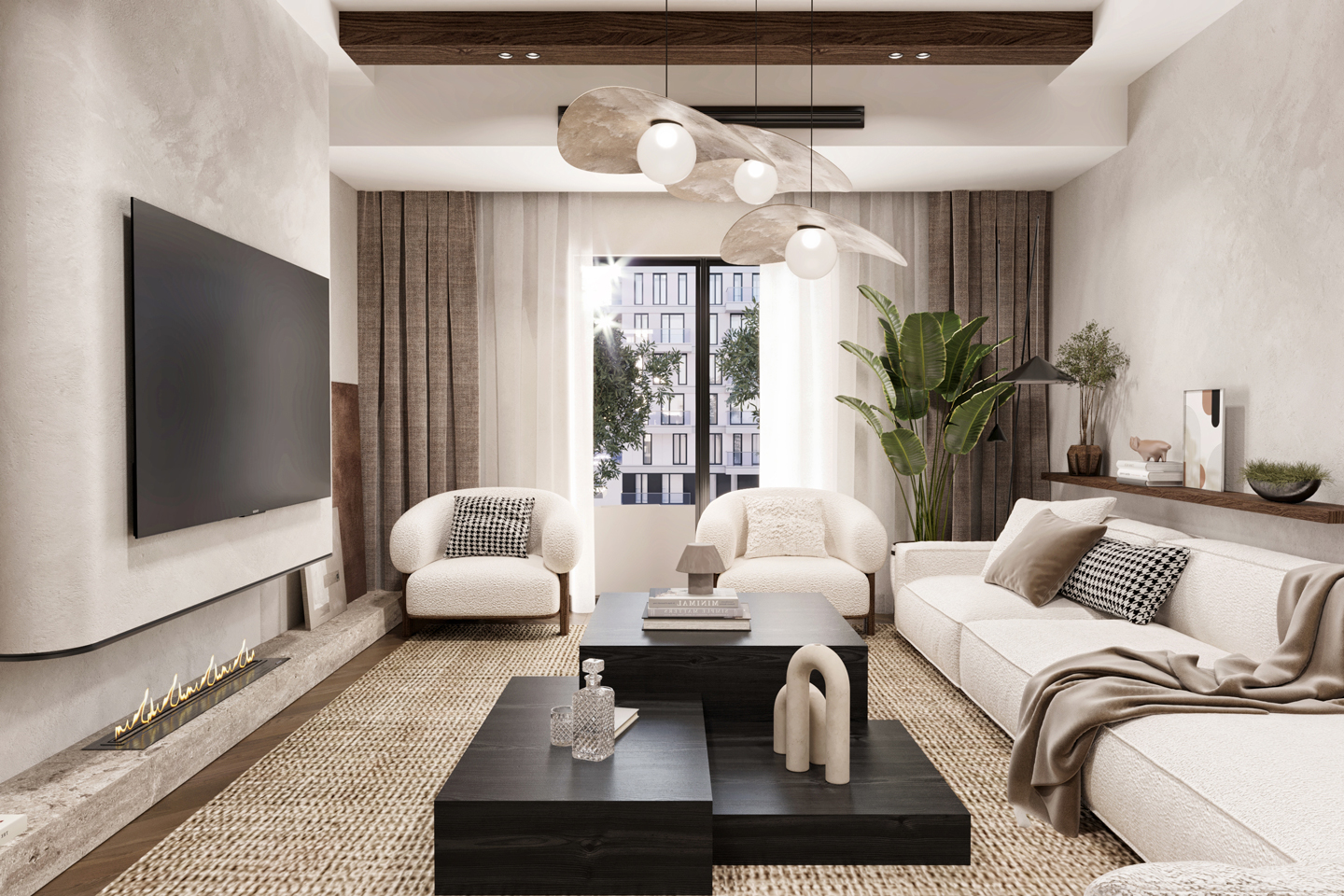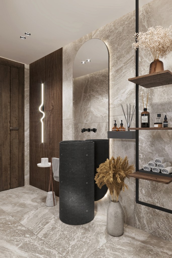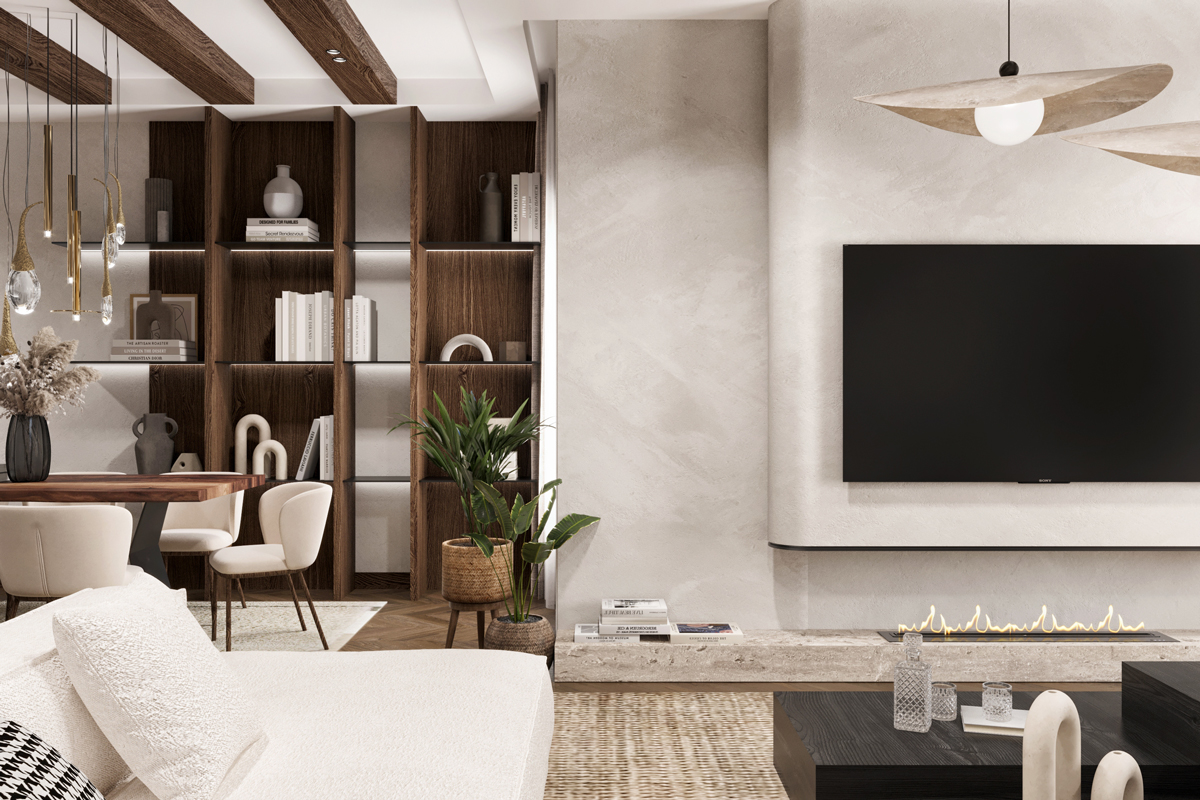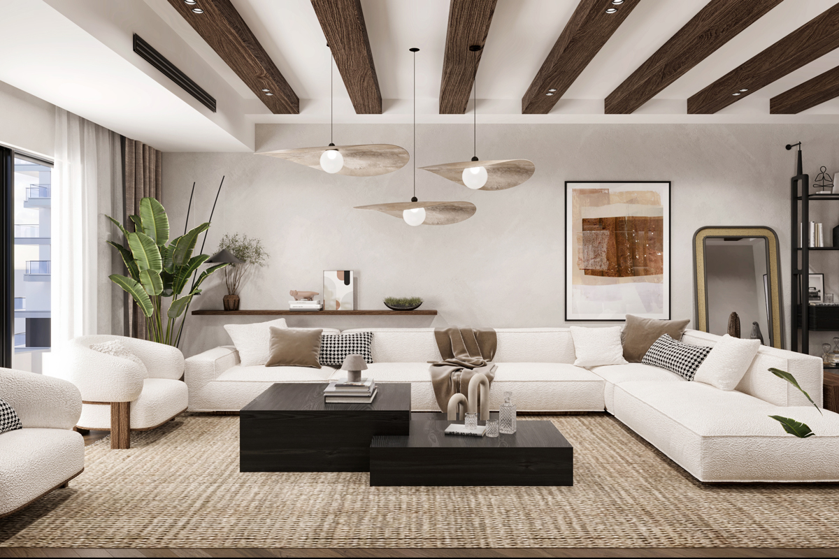 The reception area features a wooden floor, which adds warmth and character to the space. The use of wood extends beyond the floor, with wooden tables and accents strategically placed throughout the area. Contributing to the rustic aesthetic and create a cohesive design. To maintain a neutral and light color palette, the furniture is selected in shades of beige, cream, and light gray. This choice of colors creates a serene and calming environment, allowing visitors to feel relaxed and comfortable.